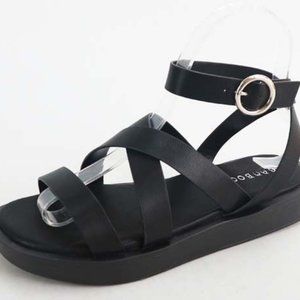 Going away for the weekend? Take these cute shoes with you! Open-toe platform sandals feature a plain toe strap, crisscrossing vamp straps, and an ankle strap with an adjustable buckle. Shoes are finished with an exposed heel and a ridged sole.