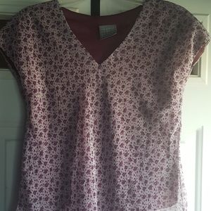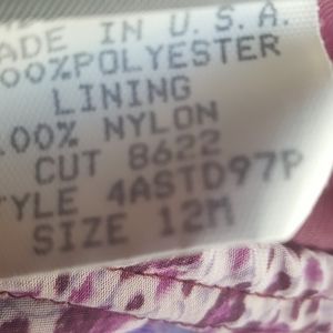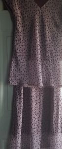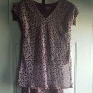 Print purple 2Pc Skirt set with linning short sleeve top modest v- neck skirt length is 36" long no flaws or snags