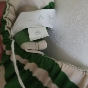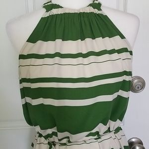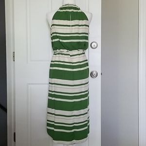 Adorable high low dress by Glam. It's olive green & cream stripes give it a sweet bit of a retro feeling. The dress slips on & has a string belt at the waist. This dress is comfortable & can be worn for a casual day around town, a date night, hanging out with girlfriends, a shower or for a summer party. This dress is new with tags & a size small.