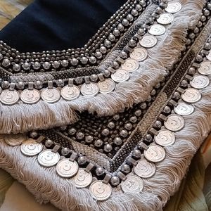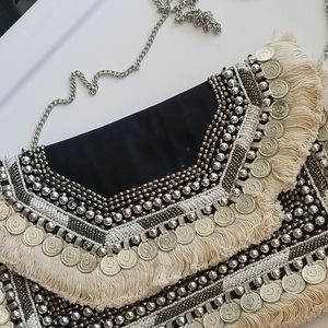 Last 1. !!!Black beaded envelope clutch. This stunning clutch features rows of silver, white beads, silver coins and cream fringe. 50 inch silver chain can be worn cross body. Magnet closure. This bag is sold out on Lyst, Vici, Revolve and Nordstroms!!!