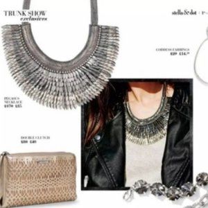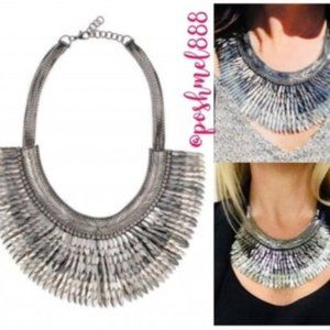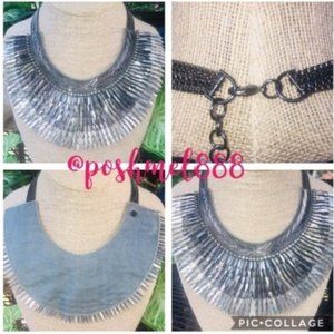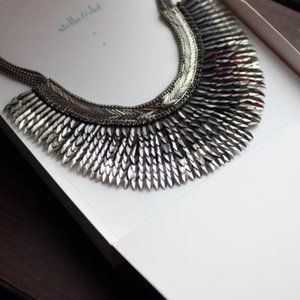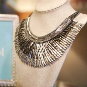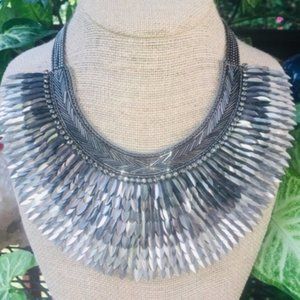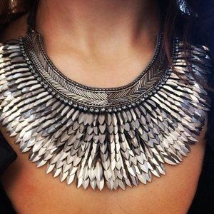 Ahhh.. THE GORGEOUSNESS OF THIS NECKLACE!! The Silver Pegasus is completely hand-made, with two days of work in every necklace. Each metallic feather is hand-stitched onto a silk organza backing, with Aztec-style hand embroidery around the neckline. Work. Of. ART. Endless compliments. Silver Limited Edition. Never even worn!! Treat yourself like the queen you are. Pair this with your little black dress for parties or simply on jeans and a black top. Then hear the compliments roll in.