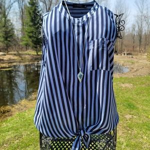 This is a great black and white polka dot cap-sleeved, tie-front top by Rafaella. Great for career wear, but looks just as adorable with a pair of jeans and some summer wedges!