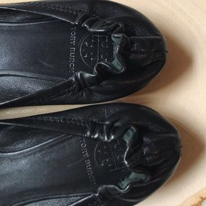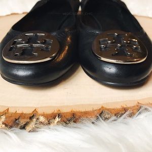 Tory Burch Reva ballet flats in black with silver medallion. Soft leather. Excellent pre-loved condition. No holes, tears, or scuffing. Normal signs of wear to the soles. Minimal signs of wear to the toe area. Silver medallion has minor scratches. Smoke free home.