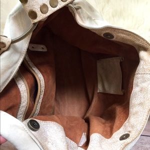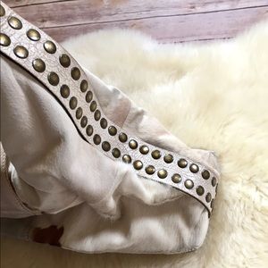 Incredible Bridget Shuster Calf Hair Shoulder Bag With Antique Gold Tone Hardware, Fold-over Flap With Magnetic Closure And Rhinestone Covered Fleur De Lis, Studded Single Shoulder Strap And Interior With Zip Pocket And Slip Pocket. Made in Brazil. **In Used Condition With Wear Visible On Calf Hair, Stains From Rubbing On Jeans, A Few Missing Rhinestones And A Small Stain On Bottom- see all pictures. Width 17”, Hight 12”, Depth 5.5”, Strap Drop 12”.