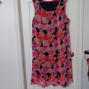 Tropical print dress in vivid pinks and oranges on black background. Fully lined with black slip. Small ruffle around bottom with zipper back. Material in light and thin. Very comfortable and cool.
