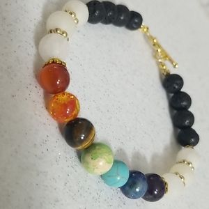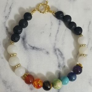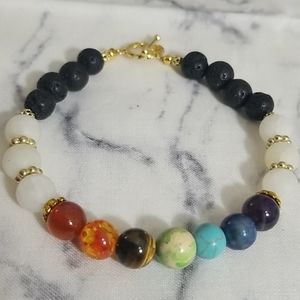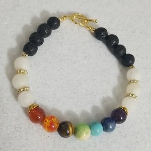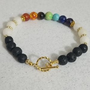 7 Chakra stone beaded bracelet featuring gold toned accents and toggle closure. Also features white Quartz and black lava (essential oil beads). Beads are approximately 8 mm in size and bracelet is approximately 7.5" in length not including the toggle closure.