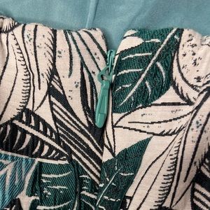 Short, strapless teal and white brocade dress