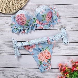 Look chic on the beach in this Sky Floral Ruffle Bikini. Appropriately placed ruffles for that flirty fun and sexy vibe!