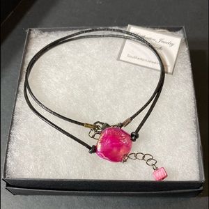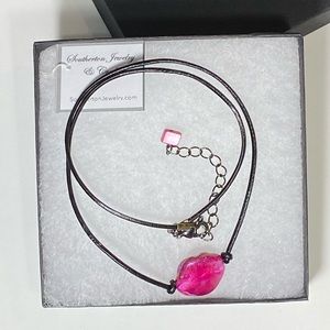 Opalescent Hot Pink Mother of Pearl Focal Shell Choker Necklace w/Adj Length Leather Chain.