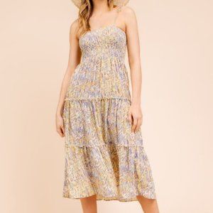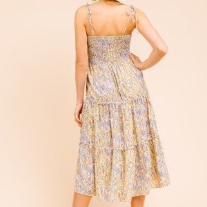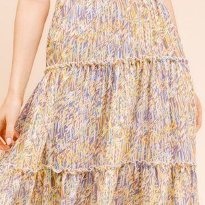 Multicoloured dress with slender spaghetti straps in a knotted self-tie at the shoulders. Embellished with ruffles at the tiered hem.