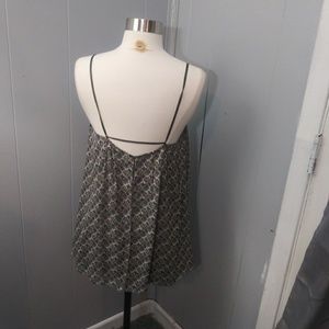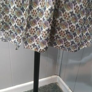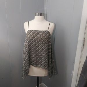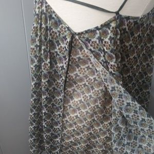 Hi low, sheer tank top in a beautiful floral pattern filled with soft greens, blues, and purples. Gold metallic vertical stripes, square neckline, wing back.