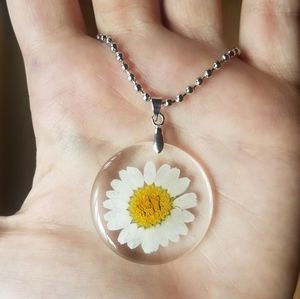 NWOT Dried White & Yellow Flower Necklace in Resin. Pendant approx 1.5", chain approx 19.5".
