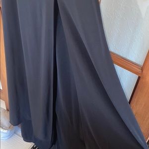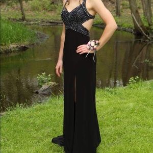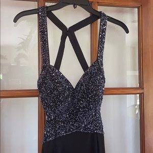 50% OFF! Beautiful floor length dress with short train, side slit, and open cross back. Worn only once and in excellent condition! Great for any formal event! Black and silver sequins bead the top.