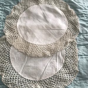 Very nice linen and crochet edge doilies for under lamps or serving plates. Two large ones are 12” diameter and two medium ones are 10” diameter. Beautiful crochet edges and no holes on linen center. These are vintage pieces from a home in MD./L