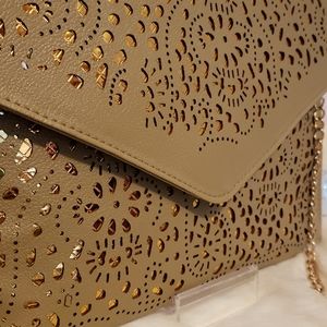 New item, In bag. Purse can be used as off the shoulder purse or as a clutch. No damage. Khaki color, with gold.