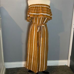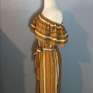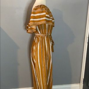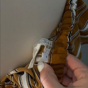 Won’t even once this off should ruffle top accent romper is mustard, black, and white striped. Size medium 6/8. No stains, rips, or holes. No piling. Smoke free home. See pictures.