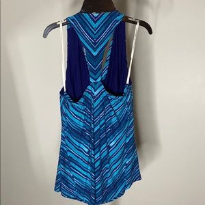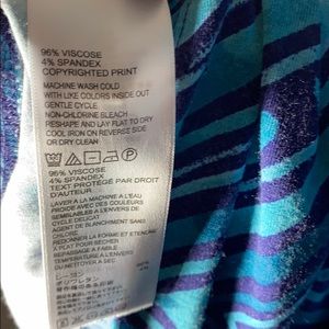 Preloved, 96% Viscose and 4% spandex. This item features a beautiful slanted print with a racer back. Wrinkle resistant and great for travel! American size Small.