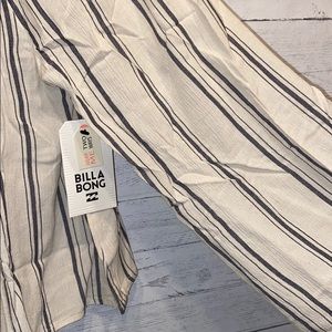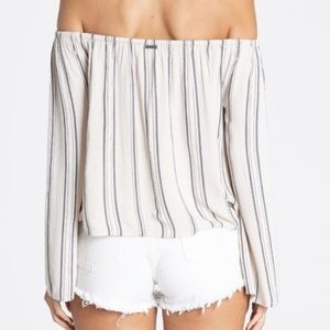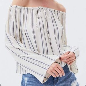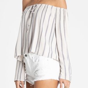 Woven blouse with long sleeves, elasticated neckline, and functional self draw cord. Wear on or off-the-shoulder