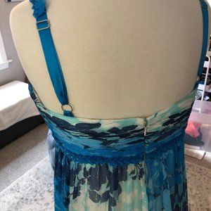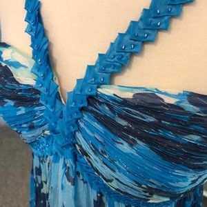 Beautiful blue, teal, navy and white grecian-inspired style BCBGMaxAzria dress. Worn once for a formal in college. Features a haltered neckline with beading details along the straps, a pretty silver sheen woven into the silk chiffon fabric, and an empire fitted top with light boning for structure. Straps are adjustable, too!