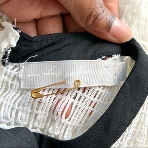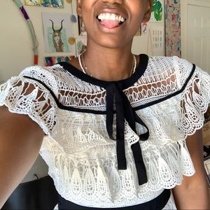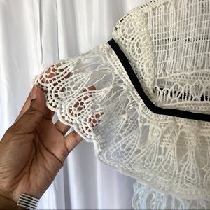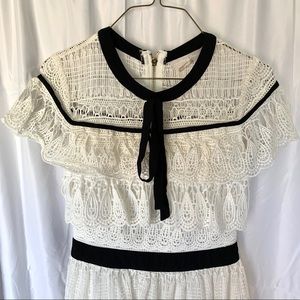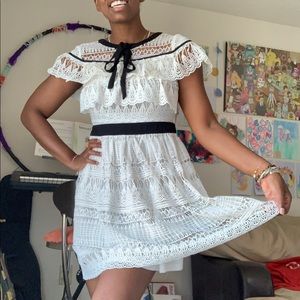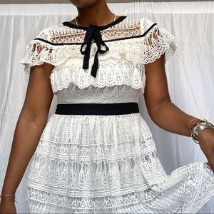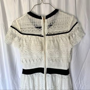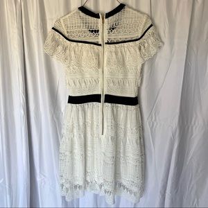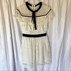 Lucy Wang White Lace with Black trim dress in a size small. This dress I super cute and is in a size small. It fits more like an XS. This dress is a lovely crochet lace with a round neck and black tie detail. There is a black waistband and a back zipper. The sleeves are a kind of cape sleeve style and the dress is more of a fit and flare style. Worn a few times.