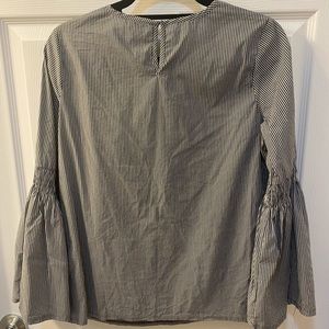 Cute, white and navy striped blouse. Cinches at elbows and flares out. Button at the top back. No flaws. Light and breathable. Size small.