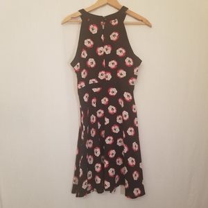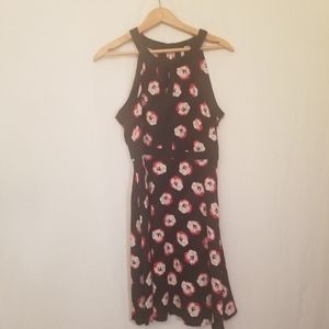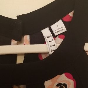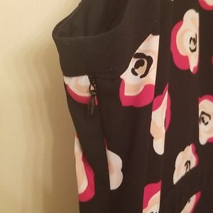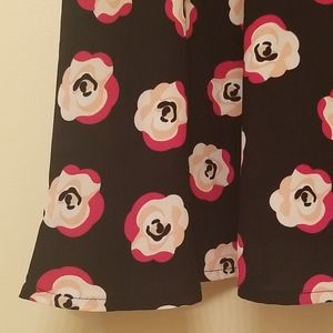 Black dress with red white and pink rose pattern.