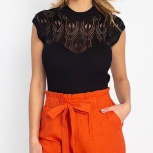 A ribbed sweater knit bodysuit featuring a sheer pointelle bodice, a ribbed mock neck, sleeveless cut, and a full coverage bottom with snap-button closures.