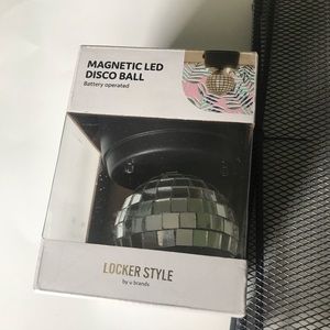 Great for back to school. Gray 12” tall shelf that holds up to 50lbs. Locker still has original packaging and zip ties on it. Magnetic disco ball is new in packaging but the sticker came off in storage. Please see pictures. Magnetic LED disco ball is battery operated. Batteries not included as it is new.