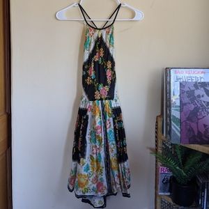 Flowy sundress with vibrant floral print, adjustable back, strappy open back. Extremely flattering, even if size is not exact. I am a size 2 but tried it on and still looked nice.