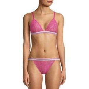 Color is Carmine Rose wth elastic stripe band. Minimal coverage.