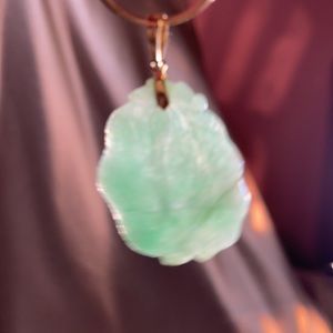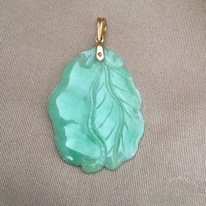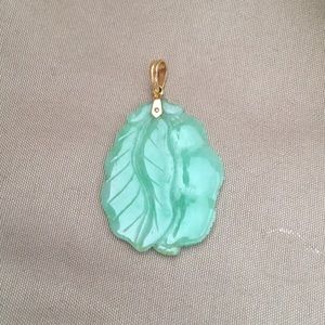 Fertility and Wealth are symbolized in this lovely pendant carving of a peapod. This natural jade is a beautiful shade and has a nice translucency. Set with a simple solid 14k (marked 585). Measures 1.5” from top of bale to bottom of pendant and 1” wide.