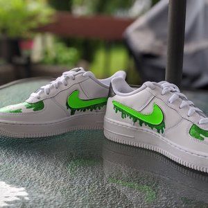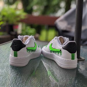Hey everyone I am selling slime air force 1s with velcro swooshes customized by myself! These are special air forces as they are painted with dripping details and 3 types of swoosh designs. Having metallic, holographic, and vibrant green swooshes helps transform the look everyday..Imagine the possibilities!