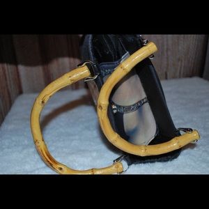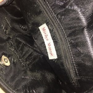 Navy blue Marilyn Monroe print on front and back. Bejeweled Rhinestone detailing. Backside has outer pocket with zipper. Inside contains two pockets and top of purse has printed button closure. Bottom has silver tone studs to help protect bottom. Printed material is a silk-like fabric. Handles are bamboo. Favorite purse of mine in great condition.