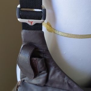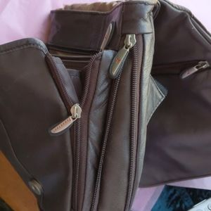 Chocolate brown. Travel bag. Looks and feels like leather. Multiple pockets.cross body strap adj up to 32in. Used 1 time.