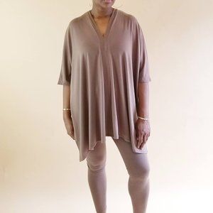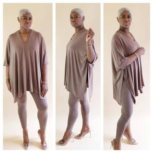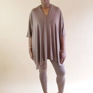 Get into this chic monochromatic two-piece set and it will surely become a fave. The super soft, over-sized tunic top has side slits to help give it a draped and flowing effect. Paired with a fitted legging, this is a quintessential wardrobe addition.