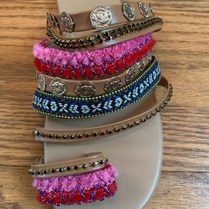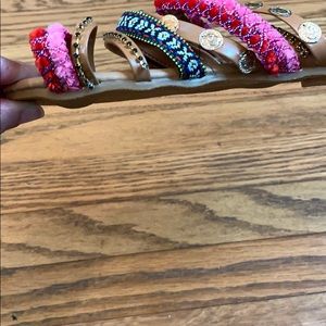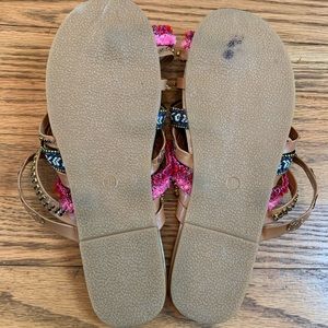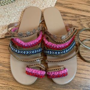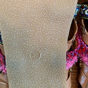 These beautiful sandals are crafted with love from India. Unique detailing gives them beauty and allows them to go with anything. They are a Euro 38 which converts to 7.5 US. Never worn!