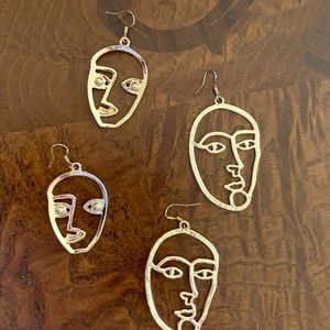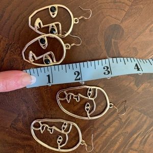 2 pairs. Very avant garde. Modern art funky earrings depicting faces. Art museum vibes. Pristine condition. Gold tone showing no wear or loss. Larger are 2” long, smaller with black jewels for eyes are 1.5” long. (Measurements don’t include hook length. Smoke free home. Quick ship.