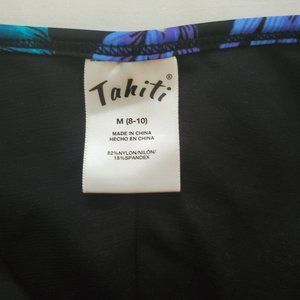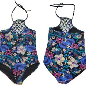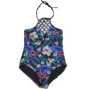 Tahiti Women's Blue/Multi One-Piece Lattice Front Halter Floral Swimsuit M(8-10)