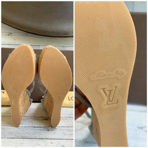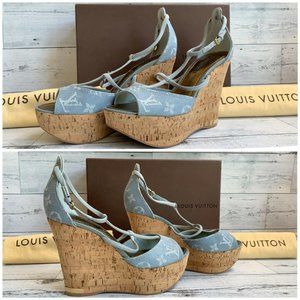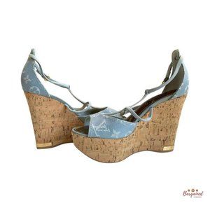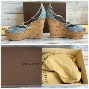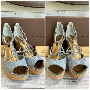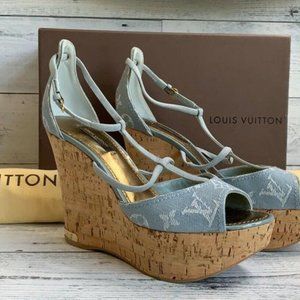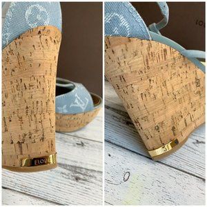 Authentic LOUIS VUITTON Denim Light Blue Wedge Open Sandal US Size 7.5 DE 0131