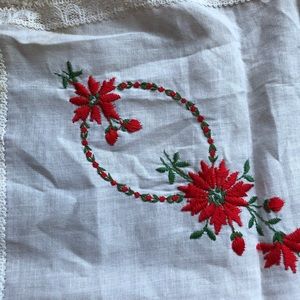 Super cute red floral design with lace trim. Some stains as pictured.