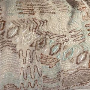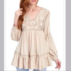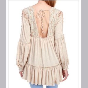 A bohemian-inspired design from Free People, the Much Love tunic features colorful embroidery, lacing details on the balloon sleeves, an open back with a tie closure and a relaxed, oversized silhouette.