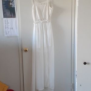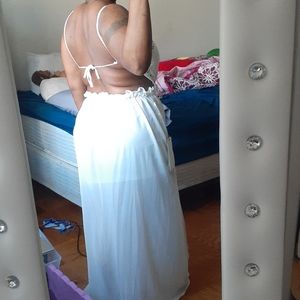 Never Worn. NWT. Goddess style backless gown. Lightweight. Floor length chiffon layering over white mini layer. Adjustable spaghetti straps with tie at center of back.
