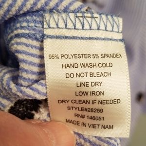 Blue and white striped short sleeve top from Monteau in a size large. Adorable crane print. Three button closure with front tie detail. 95% polyester and 5% spandex.