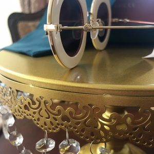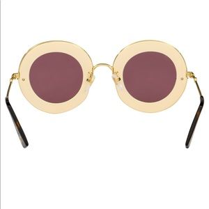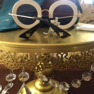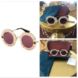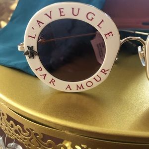 LOVE IS BLIND BRAND NEW GUCCI SUNGLASSES $800 Model: GG0113S MPN: GG0113S 002 Frame Color: Ivory / Gold Lens Color: Red Lens Width: 44 mm Lens Height: 41 mm Bridge Width: 30 mm Temple Length: 140 mm Condition: Brand New Includes: Hard Case - Satin Flannel Pouch - Microfiber Cloth |