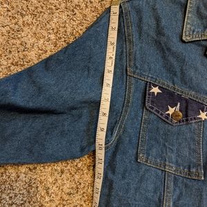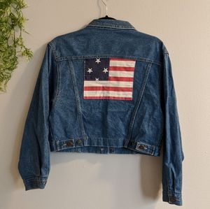 Vintage Beverly Hills Company Denim 100% Crop Americana Jean Jacket. United States Flag painted on front pockets and on back of jacket. Size mediumExcellent condition. Please see all measurements in photos. Let me know if you have any questions. :)