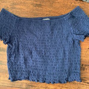 Purple off-the-shoulder crop top, ruffled fabric throughout and is a crop top and is fitted. Never worn! Can also be worn above the shoulders. Listed as size large but fits best on size medium!