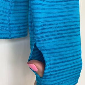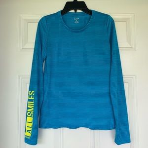 This is a long sleeved athletic tee shirt from Reebok, size large (12-14). This top features Speedwick technology. Turquoise blue with “All Smiles” in bright yellow on the right sleeve. Has thumb holes.