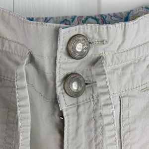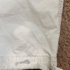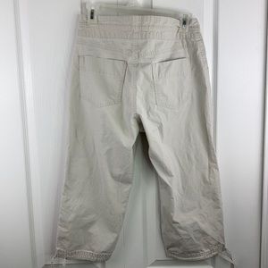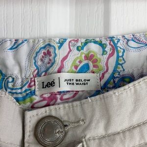 Lee Below the Waist Capri khaki Capri pants! Good condition! Small black mark on back of right leg and white discoloration in same location. Also on the front a bit of white discoloration. As shown in last 3 pictures. Lightweight khaki colored Capri pants perfect for warm weather days!