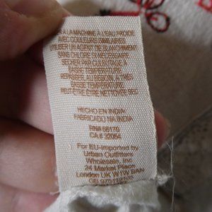 Gorgeous ivory shirt with lace up neck, elastic bottom, ruffle/flutter detail at end of sleeves, and beautiful embroidery and crocheted detailing. A few loose threads but overall in excellent condition.