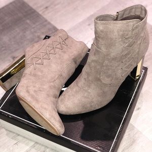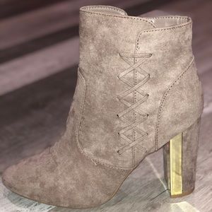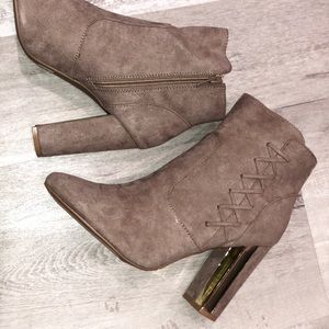 Suede taupe block heel bootie with side lace up detailing and gold detailing on the heel.